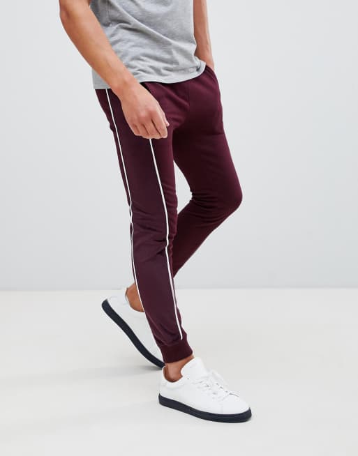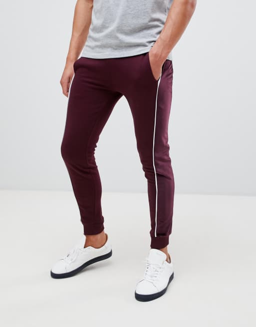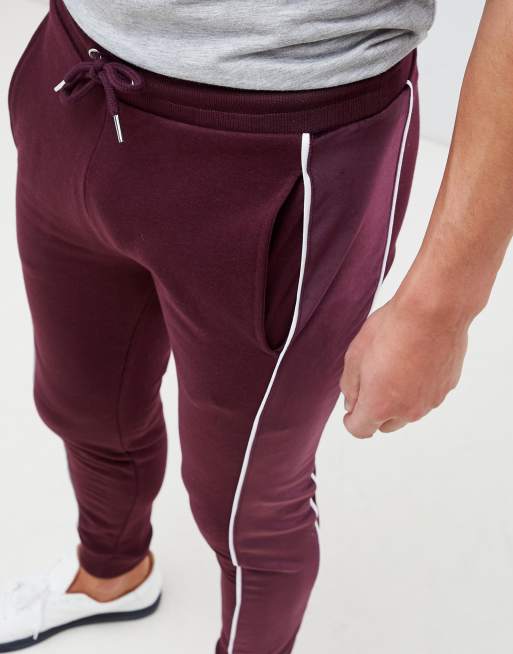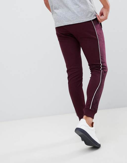 ASOS DESIGN super skinny joggers with velour side stripe and piping in burgundy