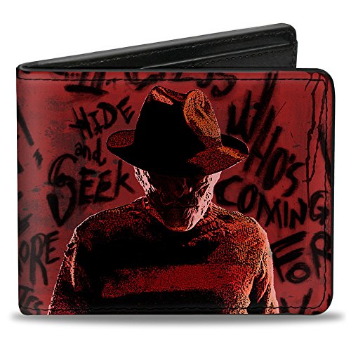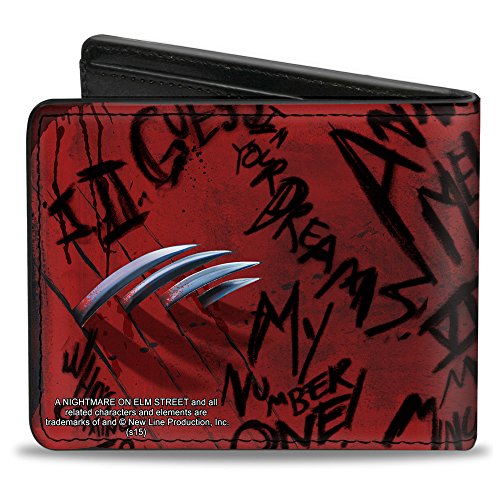 -. Binding : Apparel -. Brand : Buckle Down -. Color : Multi-color -. Department : mens -. EAN : 0700146498623 -. Feature : This awesome men's bi-fold wallet is made from premium vegan leather. / It measures 4.0x3.5x0.5 Inches, and features the standard billfold, 5 card slots, and windowed ID holder. / The logos are applied using advanced printing technologies, so the wallet will still look good after years of hard use. / The gorgeous artwork is applied using the latest printing technology, so it will hold up well over time. / This product is Officially Licensed by Nightmare On Elm Street -. ProductGroup : Apparel -. ProductTypeName : ACCESSORY -. Size : One Size -. Title : Bi-Fold Wallet - Freddy Pose2 + Hand Scratching/Quote Scrawls Reds/Black -. UPC : 700146498623