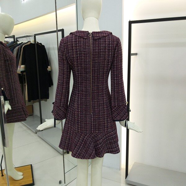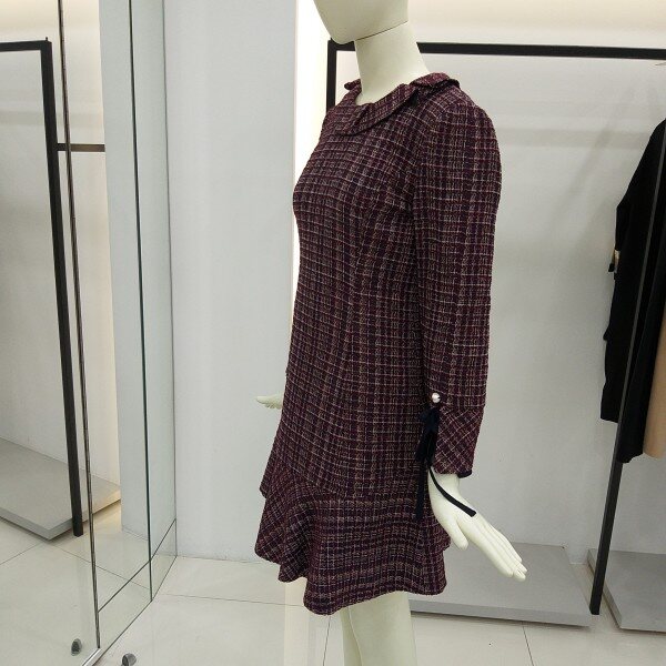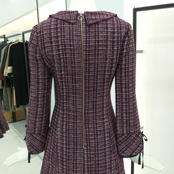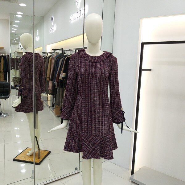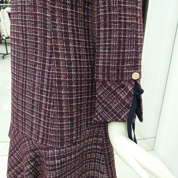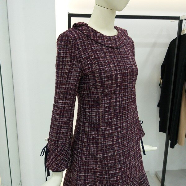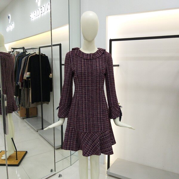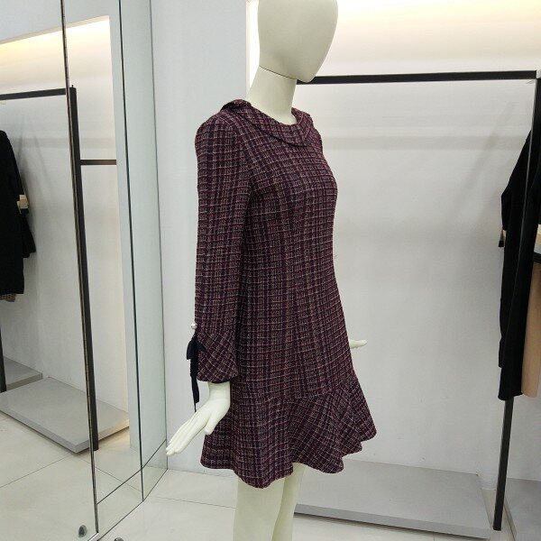 티렌 슬림핏라인으로 밑단 프릴과 트위드 원단의 고급진 원피스입니다소매 리본이중성이 여성스러워요