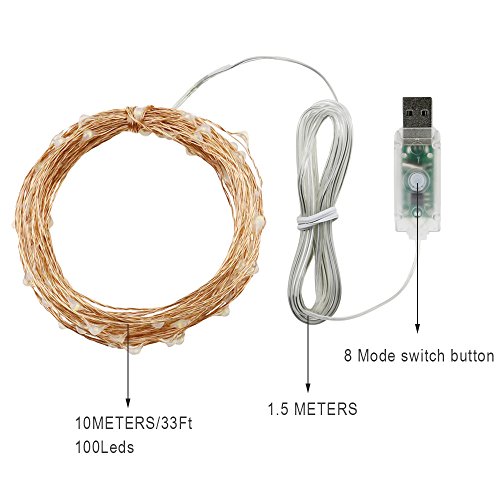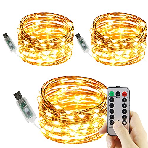 Remote USB Led String Lights,ER CHEN(TM) 100 Leds 33Ft 8 Lighting Mode Waterproof Copper Wire String lights for Bedroom, Patio, Party, Wedding, Christmas Decorative Lights(Warm White,3-Pack)