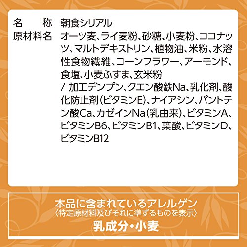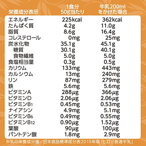 (1食50g当たり)エネルギー:225kcal、たんぱく質:4.2g、脂質:8.6g、コレステロール:0mg、炭水化物:35.1g、糖質:30.1g、食物繊維:5.0g、食塩相当量:0.3g、カリウム:133mg、カルシウム:13mg、リン:87mg、鉄:5.6mg、ビタミンA:288μg、ビタミンD:2.06μg、ビタミンB1:0.45mg、ナイアシン:4.9mg、ビタミンB6:0.49mg、ビタミンB12:0.90μg、葉酸:90μg、パントテン酸:1.8mg