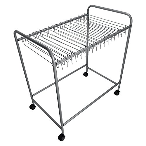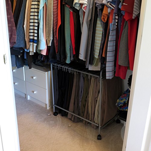 -. Feature : This rolling pants trolley is ideal for organizing all of your pants in one place. Allows you to see every pant color for pairing outfits together. / Has 4 wheels on the bottom that allow the trolley to maneuver just about anywhere. Each of the 18 pant hangers are removable for easy access. Great for dorm rooms, business travel, and closet organization. / Easy installation, comes with 8 screws for construction. Made out of light weight durable metal for support and easy transport. Has a silvertone coating over the metal bars to fit well with just about any decor. / When fully constructed, measures approximately 25.4"L by 15.5"W by 28.3"H. Each bar has a .63" diameter. Each individual hanger measures 16"L by 2.3"W with .13" diameter bars.