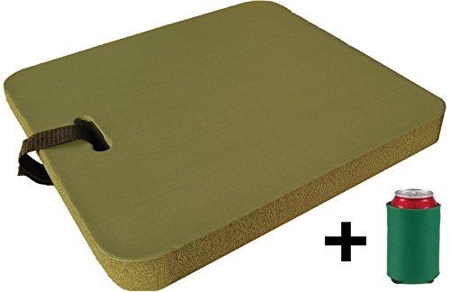 Green thick seat cushion with holding handle and velcro strap. Great for stadium, bleacher, kayak, canoe, hunting, fishing, camping, any sport or outdoor events