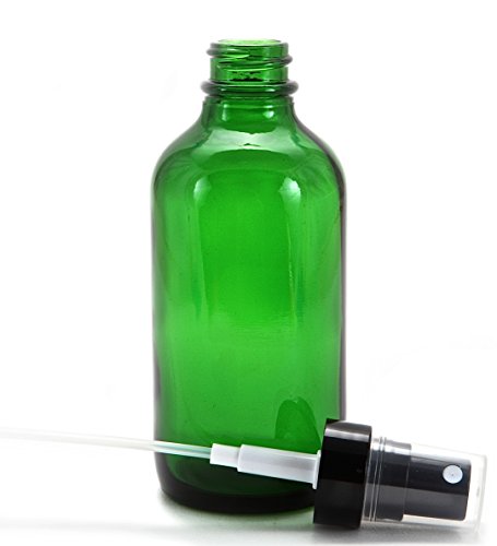 - 6 - 4 oz, Green Glass Bottles, with Black Fine Mist Sprayers, and Dust caps.