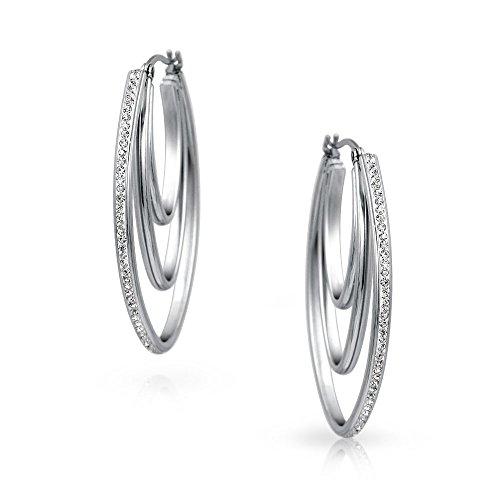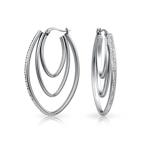 Create a signature look this season with a new pair of crystal triple hoop graduated earrings. Crafted in a modern geometric design, the largest hoop is adorned with pave clear crystals, so that these statement hoop earrings will make heads turn from every angle. The distinctive look of our crystal trendy hoop earrings will add fun to your everyday style and a great pair of hypoallergenic stainless steel statement earrings to your jewelry box. These triple hoop earrings are sure to add polish to any look and are a super cute alternative to a traditional stainless steel hoop earring.Feature