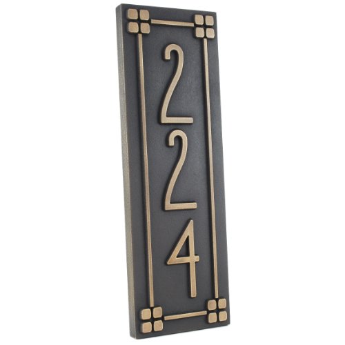 -. Title : Vertical Arts and Crafts Style Address Plaque 6x18 - Sign is Brass Metal Coated