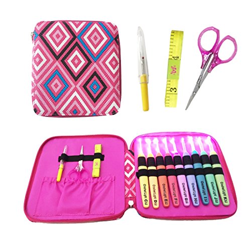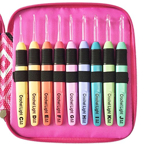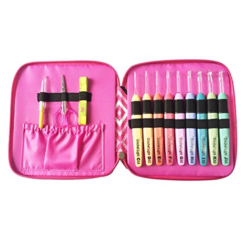 Lighted Crochet Hooks Fashion Pink Case with Crochet Accessd Illuminated 9 Hooks for Arthritic Hands - Size 2.5mm To 6.5mmories - LED Lite Hooks - Ergonomic Grip Handles & Organizer. Color Code