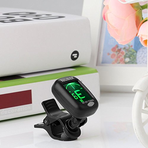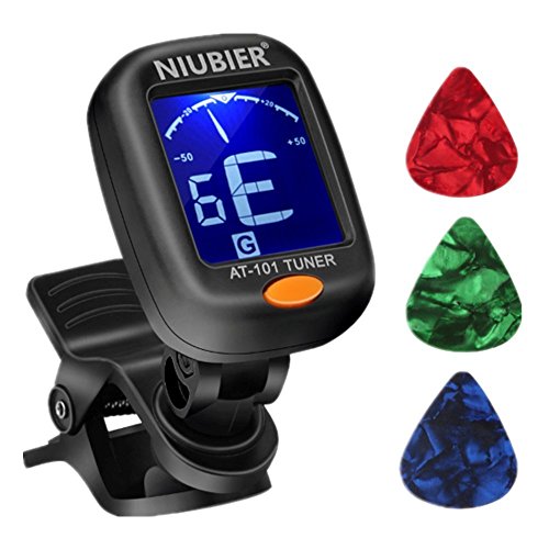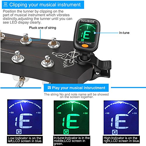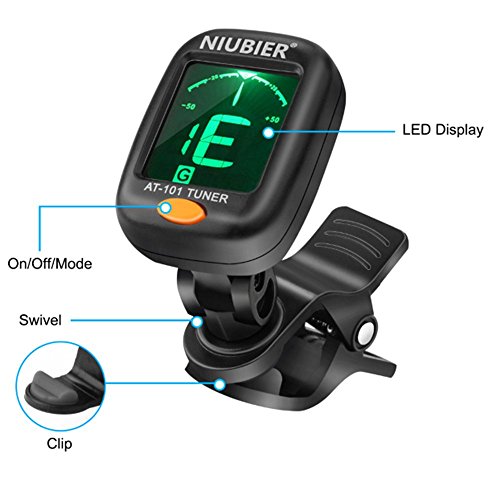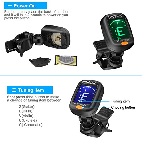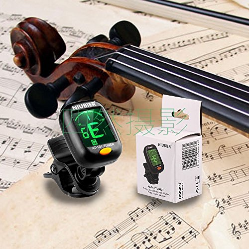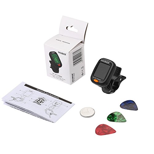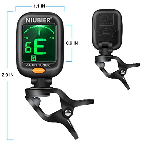 About NIUBIER 1.For the first 30 days after purchase you can return the product to us for a full refund or replacement with no questions asked;2.Every units is tested before shipping to Amazon warehouse, all items will be shipped directly from Amazon's Warehouse, receiving on time is ensured;3.Free user support: If you have any problems about the product ,Email us and you will get a respond within 12 hours.Features :Quality environmental-friendly ABS applied, Scientific design with exquisite workmanship ensure no break in use.Low defective rate of less than 0.1% ,which is much far below the industry for electronic products.Perfect for string instruments like acoustic/classical/electric guitar, bass, violin , ukulele,mandolin,banjo;Small size ,however with super bright & big LCD display.Very simple to operate,only one button controls everything:turn on /off and setting tuning modes according to your instruments.Thick & removable quality silicon pad on the clip fits well on the headstock of your instrument without damaging its finish.The tuner head turns 360 degrees for any reviewing angle for your easy reading;Auto off for no signal detected for 5 minutes to save energy.Specifications:Tuning range: A0(27.5Hz)~C8(4186Hz)Tuning scale: Chromatic, Guitar, Bass, Violin, Ukulele;Precision: 1CentA4: 430Hz- 450HzColor: BlackPower Supply: 3VDemensions: 1.34(W)x1.46(D)x1.89(H)inchWeight: 0.06 lbPACKAGE INCLUDE:1 x Tuner1 x user manual1 x coin battery3 x picksFeature
