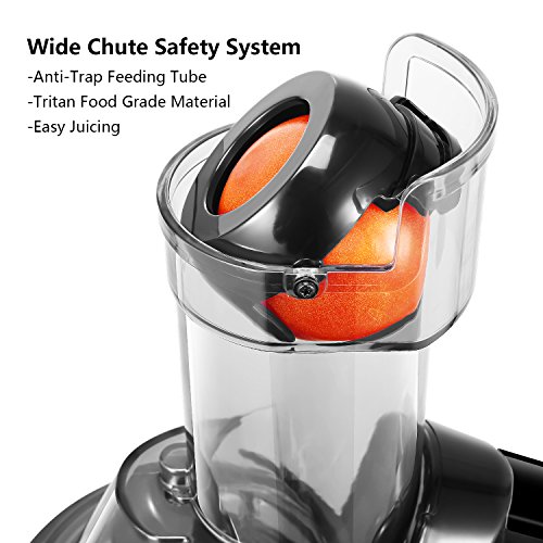 ✔LARGE MOUTH JUICER WITH BABY MATERIAL: 3" inches Wide Feeding Chute for whole fruits and vegetables process which saving the slice and pre-cut time. The silicone components and the PEI juicing screw are made of high quality TRITAN food grade anti-oxidation materials.Try to juice orange, apple, tomato, cabbage, carambola and celery, All of this fruits are making a good juicing yield. Best big mouth machine you never meet before.