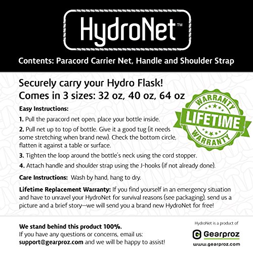Studio : Gearproz Publisher : Gearproz Binding : Misc. Product Description LIFETIME REPLACEMENT WARRANTY FROM GEARPROZ: They know how much you love quality gear... and so do they. If the HydroNet does not meet your expectations, Gearproz will return your money. BONUS: If you ever have to unravel your paracord survival net in an emergency situation, send your story to Gearproz. They will send you a replacement HydroNet bottle carrier FREE OF CHARGE! 0