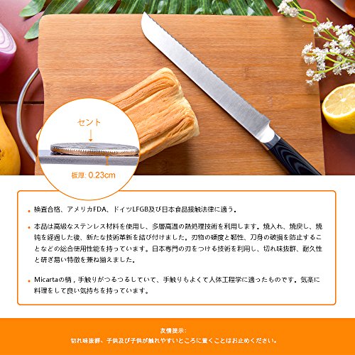 【안전성】●검사 합격,미국FDA,독일LFGB및 일식품 접촉 법률에 맞았습니다.만약 중금속을 초월하면,인체에 중대한 악영향을 가져옵니다.다른 빵 잘라 부엌칼을 구입이 되는 경우,반드시 제품의 규격으로 안전성을 숙고 해 하십시오.