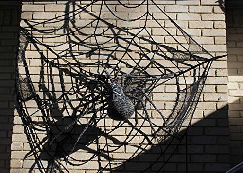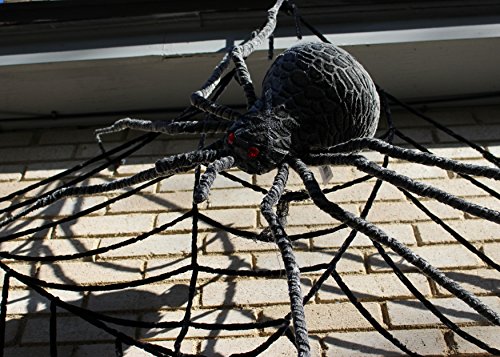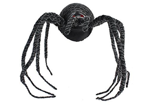Amazing detail in a spider large enough to cover your picture window. Giant Gray spider covered in textured gray fabric and large body. Terrifying when posed to jump and fangs bent to bite with beady red eyes glaring. Dare you to add this menace to frighten friends and family.