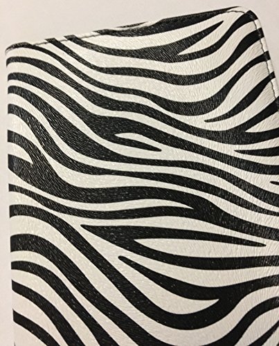 -. Feature : Made of Durable Vinyl- compact 8in H x 5in W / 2 Verticle pockets for Large Bills or Credit card reciepts / 2 Horizontal Pockets for note pad and cash / Zipper pocket for change & Pen Loop / Black and White Zebra P.R.Int Exterior/Solid Black Interior