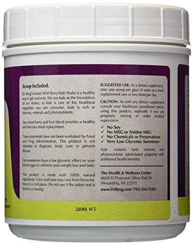 -. Binding : Health and Beauty -. Brand : Dr. Berg's Nutritionals -. EAN : 0852672910428 -. Feature : MEAL REPLACEMENT | If you're busy and want a convenient way to lose weight, Dr. Berg's Instant Kale Wild Berry Shake is a healthy alternative to unhealthy, calorie-packed, drive-thru meals. It has the concentration of one of the healthiest nutrient-rich foods on the planet: KALE. Supply your body with a healthy and filling meal alternative once per day. Delicious and easy to prepare, just add water and shake. It's rare to find a shake that is both healthy and great tasting. / WEIGHT LOSS | Our Instant Kale Wild Berry Shake works by supplying your body with high-quality nutrition without the sugar, hidden sugars or chemicals. This product has less than 1 gram of sugar per serving. The protein triggers fat burning and the nutrients enhance your metabolism. And the fruity and refreshing wild berry flavor helps satisfy sweet cravings without relying on added sugars or caffeine. Drink it to start your day the right way, or use it to keep you going as a mid-day snack. / NO ADDED SUGARS | Many meal replacement shakes contain hidden sugars and cheap, unhealthy ingredients that actually make weight loss more difficult. Our Instant Wild Berry Kale Shake has no added sugar, synthetic vitamins, artificial flavors, egg whites, or soy, and contains less than one gram of sugar per serving size. Best of all? A single serving is only 40 calories. / VEGETARIAN | Our shakes are made with vegetarian ingredients. It contains no soy isolates, adhering to a vegetarian diet without compromising the quality because we use kale as the main nutrient. Just 1 serving contains over 300mg of potassium. This vegetarian shake is good for burning fat and supporting a healthy metabolism. Click the 'Add to Cart' button now to start your journey to a healthier you. / 100% SATISFACTION GUARANTEE! | With over 26 years of experience assisting over 45,000 patients in achieving healthy weight loss, Dr. Berg has created a line of products and supplements that support his message of 'getting healthy to lose weight, not losing weight to get healthy.' If for any reason you are not happy with the results you experience from taking our Instant Kale Wild Berry Shake, we're happy to return it for a full refund. -. IsAdultProduct : 0 -. Label : The Health & Wellness Inc. -. LegalDisclaimer : The products and the claims made about specific products on or through this site have not been evaluated by the United States Food and Drug Administration and are not intended to diagnose, treat, cure or prevent disease. The information provided on this site is for informational purposes only and is not intended as a substitute for advice from your physician or other health care professional or any information contained on or in any product label or packaging. You should not use the information on this site for diagnosis or treatment of any health problem or for prescription of any medication or other treatment. You should consult with a healthcare professional before starting any diet, exercise or supplementation program, before taking any medication, or if you have or suspect you might have a health problem. -. Manufacturer : The Health & Wellness Inc. -. PackageQuantity : 1 -. ProductGroup : Health and Beauty -. ProductTypeName : HEALTH_PERSONAL_CARE -. Publisher : The Health & Wellness Inc. -. Studio : The Health & Wellness Inc. -. Title : Instant Wild Berry Kale Shake - Vegetarian Shake - Dietary Supplements for Weight Loss By Dr. Berg -. UPC : 852672910428