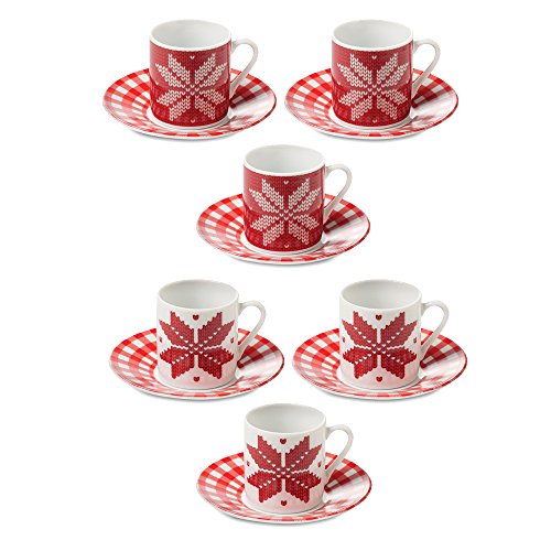 -. Brand : eBuyGB -. Color : Red -. EAN : 0008963271376 -. Feature : Brand New Christmas Espresso cup set with a Red & White Nordic design. The set contains 6 espresso cups, 6 matching saucers and a matching gift box which makes it a perfect gift for a coffee lover / he small cups have a stitched snowflake nordic design on them, the saucers have a checked (gingham) design around the edge and the red gift box has a small white snowflake printed on it on the top. / These are small espresso cups perfect for espresso coffee (a shot of coffee), and can be used with most coffee machines, each mug holds up to 50ml and measures 2.16" diameter x 1.96" -. Label : eBuyGB -. Manufacturer : eBuyGB -. MPN : 1278405 -. PartNumber : 1278405 -. ProductGroup : Kitchen -. ProductTypeName : KITCHEN -. Publisher : eBuyGB -. Studio : eBuyGB -. Title : 12 Piece Christmas Espresso 6 Cup & Saucer Set - Nordic Xmas Style with Gift Box -. UPC : 008963271376