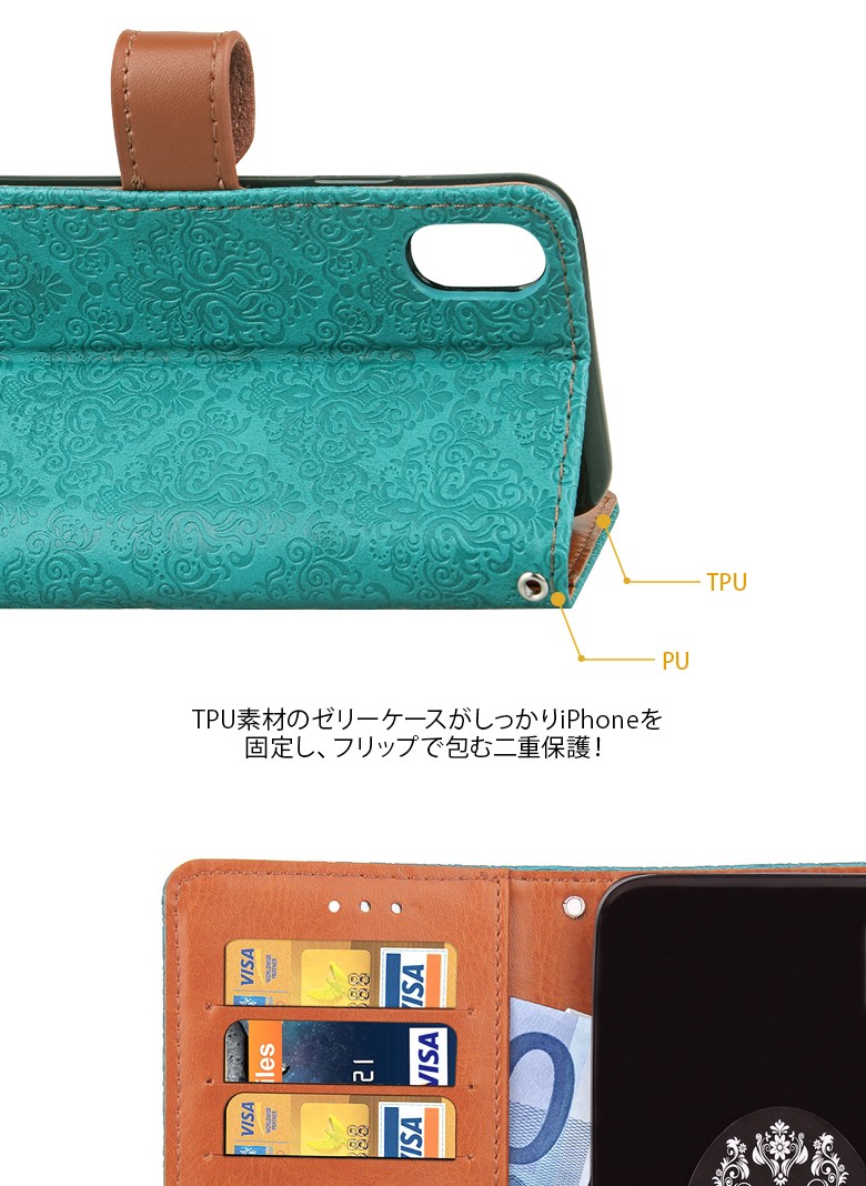 | 商品説明 | TPU素材のゼリーケースがしっかりiPhoneを固定し、フリップで包む二重保護!iPhone X 手帳型ケース! |