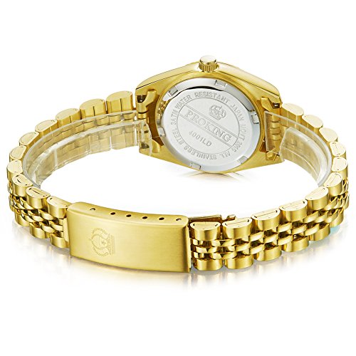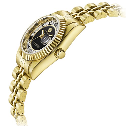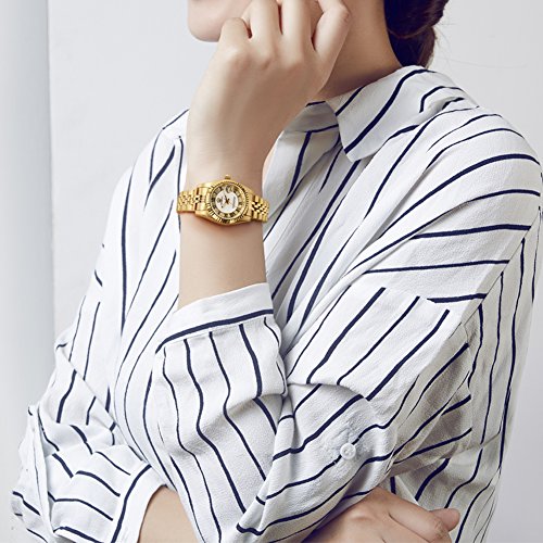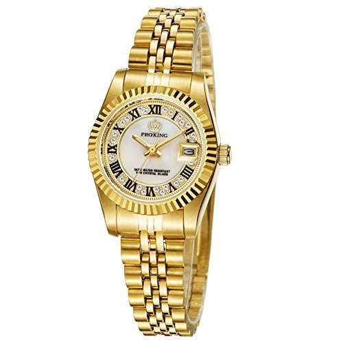 Mother of pearl dial with luminous yellow gold-tone hands and diamond.