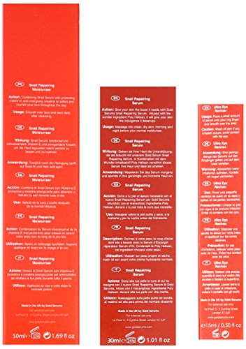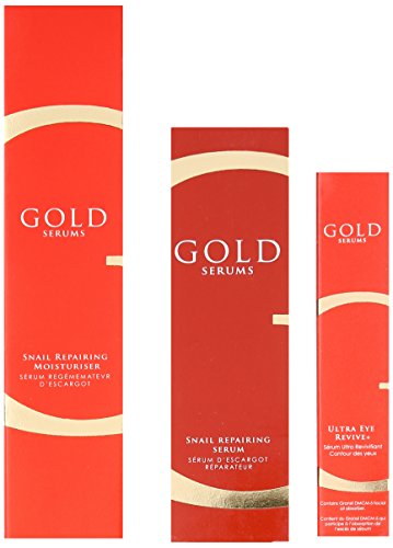 -. Feature : Snail Repairing Serum is infused with the wonder ingredient Poly Helixan, which has been hailed for its protective and nourishing properties / Poly-helixan is a powerful active ingredient, natural and ecological, extracted from a defensive liquid secreted by snails / Gold Serums Snail Moisturizer is the perfect accompaniment to the Serum, as the skin is also given a boost of intense moisturisation / kin should be left feeling soft and nourished, and protected against external elements / Ultra Eye Revive + is combines the finest active ingredients for the eye area