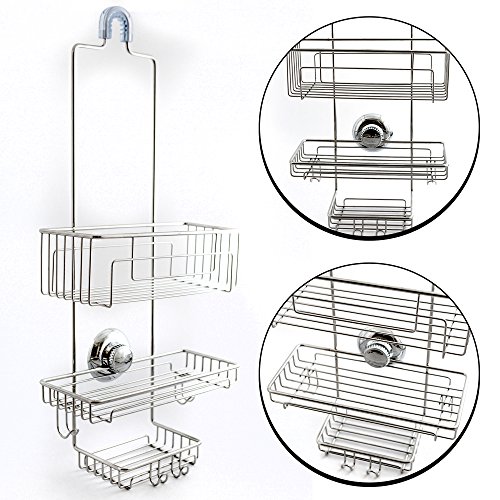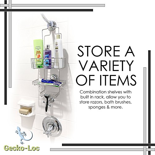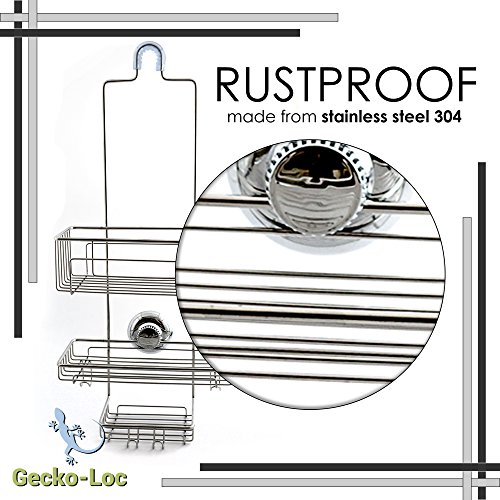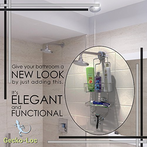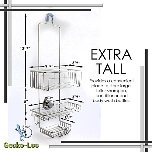 Gecko-Loc Over the Shower Head Tall Shower Caddy Organizer with Super Suction Cup & Shower Head Hanger - Stainless Steel Rustproof