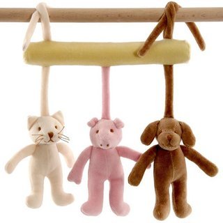 Cute little mobile for your little one to play with. You can tie it to the crib, car seat or the stroller. Each animal makes a different sound. One rattles, one rustles and the other one squeaks.