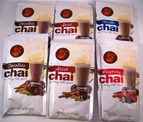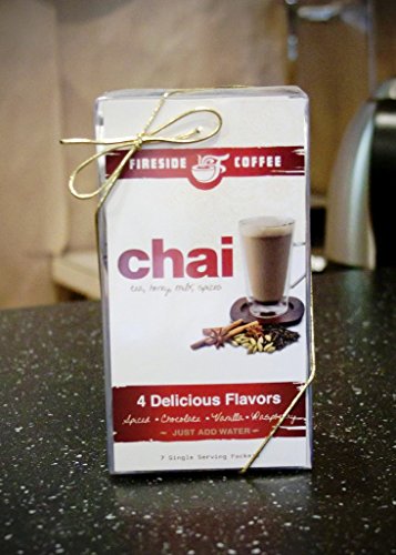 -. Feature : Fireside Coffee Chai Sampler Gift Box 6 Assorted packets 1.2 Oz / 2 Chocolate Chai 1.5 oz, 2 Spiced Chai 1.2 oz, 1 Raspberry Chai 1.2 oz and 1 Vanilla Chai 1.2 oz. / Each packet makes an 8-10 oz. cup. / Add the chai mix, to water and ice together in a blender and you'll have a perfectly smooth and chai frappe! / "As Seen on Good Morning America!"