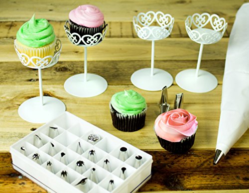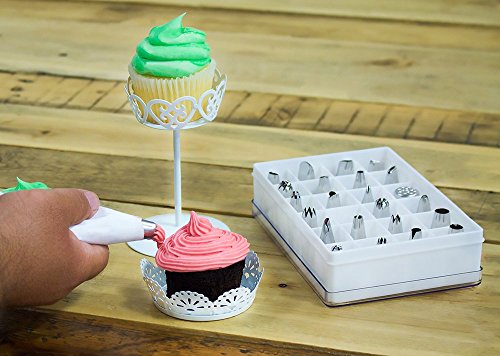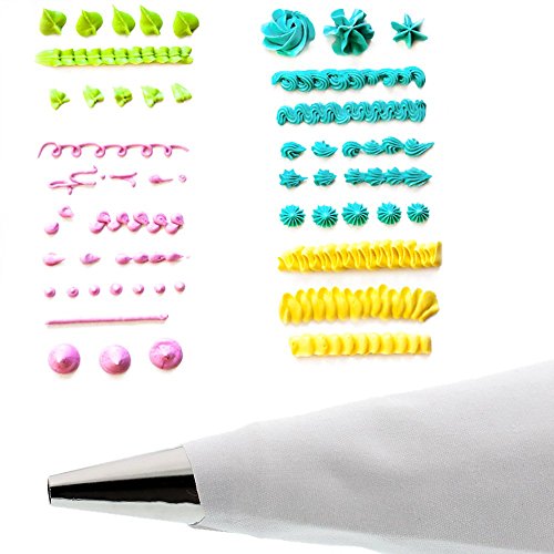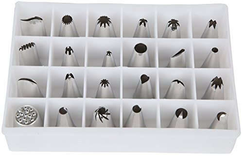 - The Juvale premium cake decorating set includes an 18" re-useable pastry bag, hinged plastic tray with clear top for easy storage and 24 nozzle tips for creating beautiful patterns and designs.