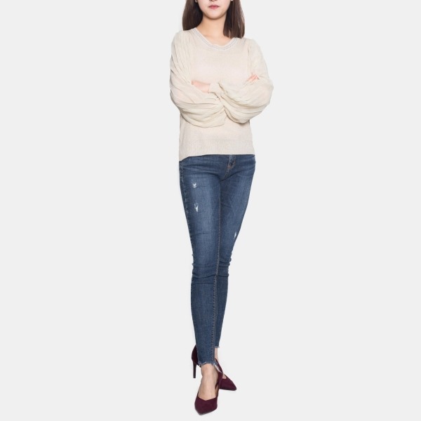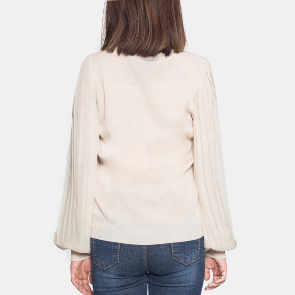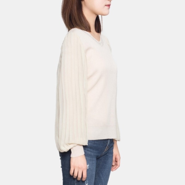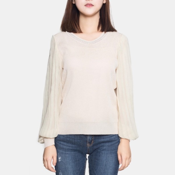 포근한 니트 조직감과 가벼운 소재감의 플리츠가 포인트가 되는 풀오버입니다. 이지한 진이나 슬렉스에 매치시 사랑스러운 느낌을 주는 룩이 연출됩니다.