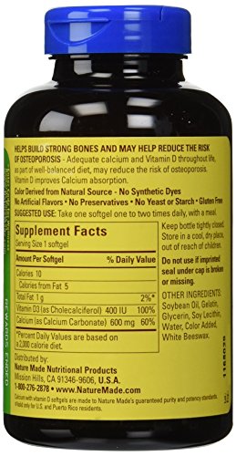 Nature Made Liquid Softgel Calcium is an easy-to-swallow softgel that provides adequate calcium and vitamin D to help build and maintain strong bones and teeth and may help prevent osteoporosis. Calcium is the most abundant mineral in the body with more than 99% of the bodyâ€TMs calcium found in bones and teeth. In addition to its important role in bone health, calcium plays a role in other bodily processes such as muscle contraction, regulation of heart beat, release of neurotransmitters and also assists with the clotting of blood.Feature