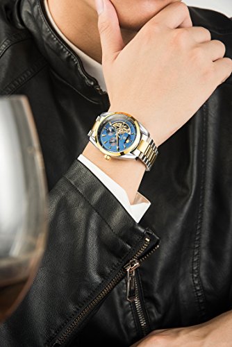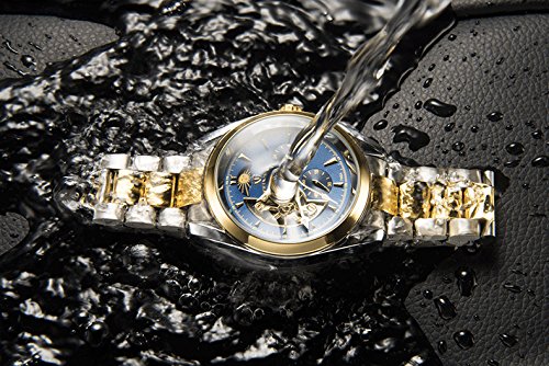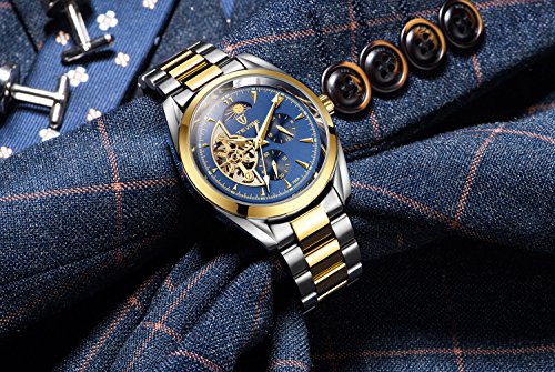 TEVISE 비지니스 손목시계 맨즈 아날로그 스테인레스 벨트 케이스 24시간 자동 감기 워치 (골드블루)