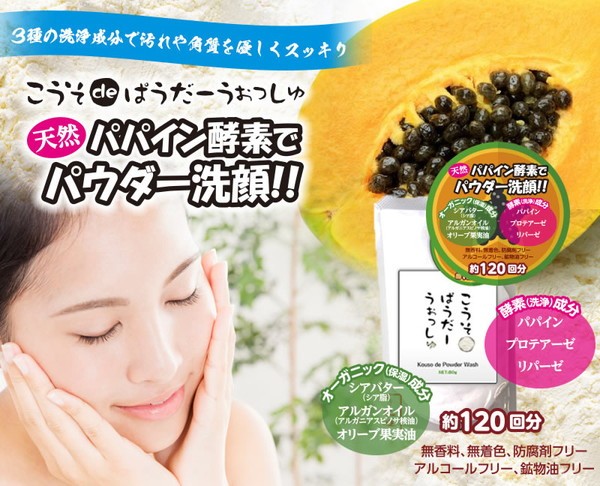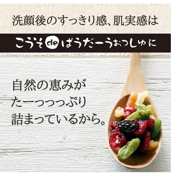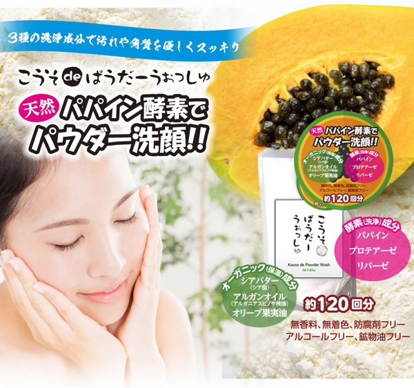 カリ含有石ケン素地、バレイショデンプン、コーンスターチ、タルク、ラウロイルグルタミン酸Na、アルブミン、デキストリン、シリカ、パパイン、プロテアーゼ、リパーゼ、スクワラン、シア脂、アルガニアスピノサ核油、オリーブ果実油、アスコルビン酸、コメヌカエキス、カミツレ花エキス、ローズマリー葉エキス、リン酸2Na、リン酸K、ラウリン酸、グリセリン、水、BG |