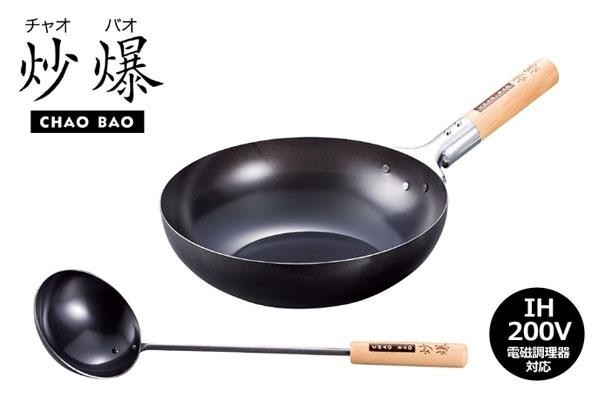 炎であおらなくてもシャキッと仕上がる中華鍋。IHでも本格中華が思いのまま!!熱くなりにくい木製のハンドルなど、使いやすさにもこだわりました。便利なお玉付☆ |