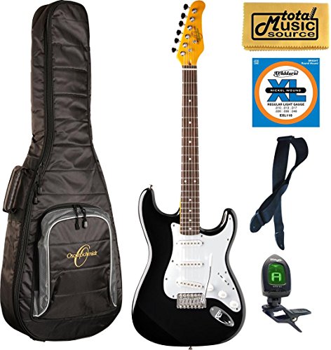 Studio : Oscar Schmidt Publisher : Oscar Schmidt Product Description Features: Model: OS-300 BK Double cutaway body Solid Maple Body White pickguard Rosewood fingerboard Maple neck Nut With: 1-5/8 Standard tremolo bridge with Trem Bar Adjustable truss rod Dot inlays 3 single coil pickups 1 volume, 2 tone controls 5-way pickup selector Chrome diecast tuners and hardware Gloss finish 0