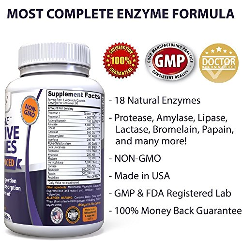 WHY IS BIOGANIX DIGESTIVE ENZYMES THE BEST? - Our Daily Essential Enzyme formula has 18 enzymes, is non-GMO, and is made right here in the USA, in GMP Certified and FDA Registered Facilities to the highest standards. All our products are also 3rd Party Lab verified. (Ask us for the Certificates). We are so proud of the gold quality of our products - we offer a 100% Money Back Guarantee! If you dont feel the benefits, just contact us!