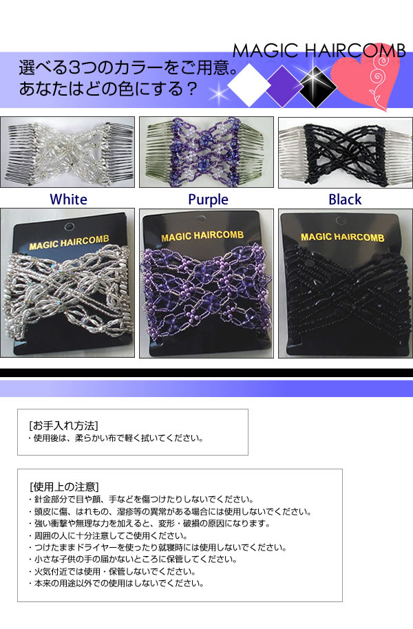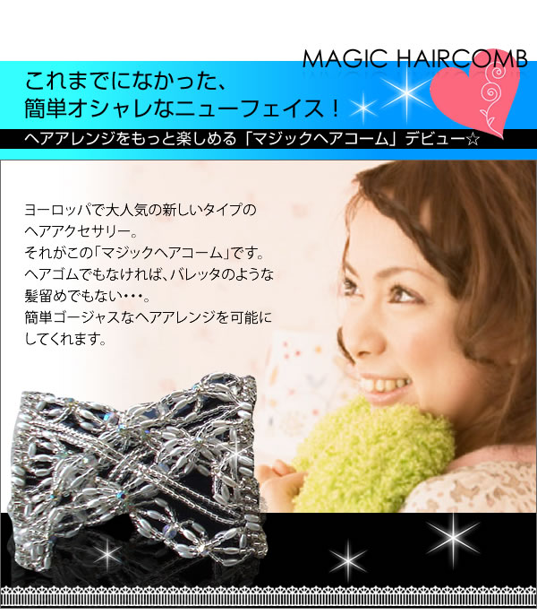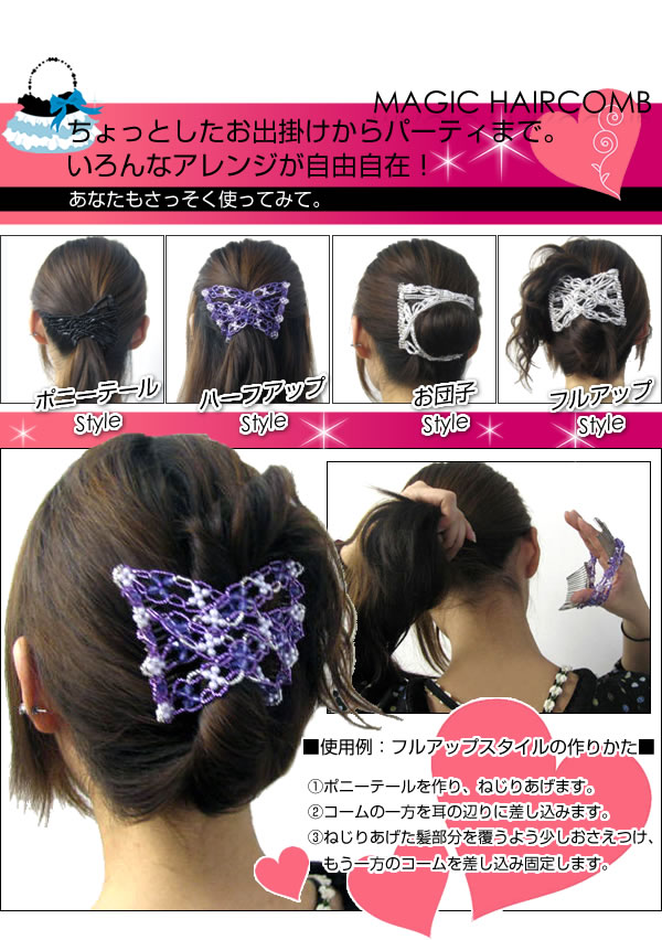 ヨーロッパで大人気の新しいタイプのヘアアクセサリーが登場!ダブルコームで伸ばして留めるだけで、髪をしっかりホールドして崩れません。簡単にゴージャスアレンジの完成っ☆
