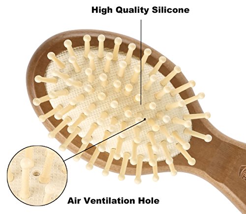 - HIGH QUALIFIED: Handcraft finished. Our natural wood hair brush and Comb are made of natural wooden material, suitable hand-held wooden haddle, food grade silicone cushion. Firm and qualified wooden bristles spaced with perfect width and depth that will not lose their shape.