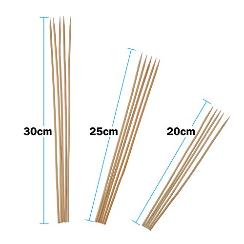 Multiple size and enough quantity: This set of bamboo skewers contain 3 sizes includes 20 cm/ 8 inch, 25 cm/ 10 inch, 30 cm/ 12 inch, 100 pack for each size; Various sizes and enough quantity comes in a package, make it convenient and satisfy your needs. BBQ skewer: Easier to move around the grill; You can soak the skewers in water overnight if necessary, so as to not have them catching fire and burning your food. Convenient to take and use, suit to outdoor events, camping, catering events or any party events. Good kitchen helper: The skewers themselves are sturdy, don't break easily. Would be just as fine to use it to skewer fruits in interesting shapes to serve eaters. Good for stick fish, steak, hot dog, chicken, seafood, vegetables, fruits, sandwiches etc. Make the food orderly and beautiful, convenient to pick and eat. Making fragrant crafts: You can use these bamboo skewers to stir perfumes so that the fragrance would stay in the wood. Then apply these skewers to make handmade flowers or other crafts which will stay fragrant for a long time. Decorate your pot culture: You can also make a fence for your pot culture, knit or embellish on it to decorate you little garden; You can also make other crafts, just fly your imagination. Specifications: Quantity: 300 pieces Material: bamboo Diameter: 3 mm/ 0.12 inch Length: 3 sizes, 20 cm/ 8 inch, 25 cm/ 10 inch, 30 cm/ 12 inch Package includes: 100 x 8 Inch bamboo skewer 100 x 10 Inch bamboo skewer 100 x 12 Inch bamboo skewer 0