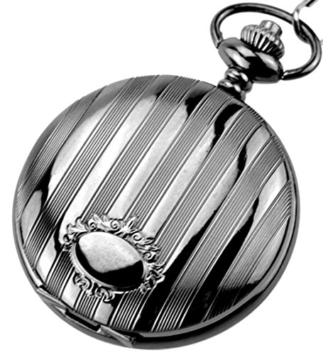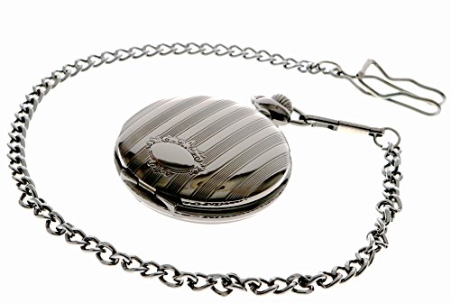 -. Title : Vintage Black Stainless Steel Quartz Pocket Watch with Chain