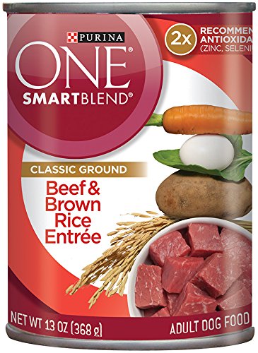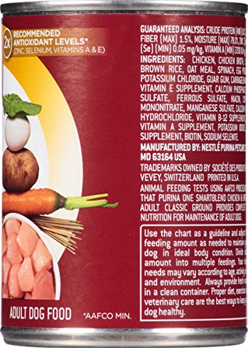 Satisfy your dog's cravings and give him the nutrition he needs with Purina ONE SmartBlend Classic Ground Chicken & Brown Rice Entree adult wet dog food. Made with real chicken, brown rice and oat meal, this high-quality dog food delivers the wholesome goodness you demand. It features a highly digestible formula, so more nutrition goes to work inside your dog, and the SmartBlend of ingredients helps provide complete and balanced nutrition. Because it's made with 0% fillers, this formula lets you rest easy knowing that every high-quality ingredient has a purpose. The tender, meaty morsels in every serving deliver the taste and texture dogs love, and the protein content helps support your dog's strong muscles. Make this wet dog food part of your pet's daily feeding routine, and give him lifelong nutrition in each bowlful. Try serving Purina ONE SmartBlend Classic Ground Chicken & Brown Rice Entree adult wet dog food to your pet today, and show him exactly how much you love him.Feature
