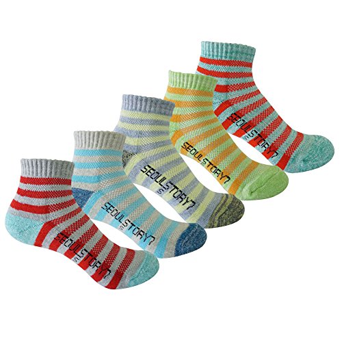 -. Brand : SEOULSTORY7 -. Color : Multi Color -. Department : Womens -. Feature : 77%Cotton,14%Spandex, 2%Polyester, 7%Elastine / Small size fits Women shoe 6-8US / Light to Minimum Terry pile cushion on the botton foot / Mesh ventilation zone on top, Season:Summer / Made in South Korea -. Label : Seoulstory7 -. Manufacturer : Seoulstory7 -. ProductGroup : Sports -. ProductTypeName : OUTDOOR_RECREATION_PRODUCT -. Publisher : Seoulstory7 -. Studio : Seoulstory7 -. Title : 5Pack Women's Light Cushion Mini Hiking/Camping/Performance Socks