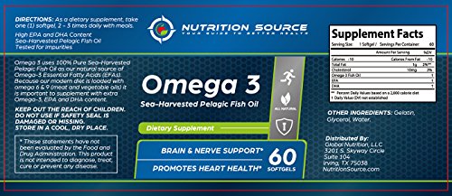 Nutrition Source Omega 3 Fish Oil is extremely high quality and free of all harmful contaminates. Using only 100% pure sea-harvested pelagic fish oil, making this supplement high in EPA and DHA. Other benefits include: Support brain health and cognitive response, promote healthy inflammatory responseFeature