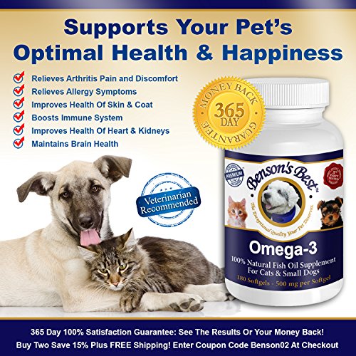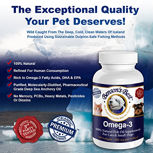 - Feature : ❤THE ONLY OMEGA-3 FISH OIL SOFTGEL CAPSULES SMALL ENOUGH FOR CATS AND SMALL DOGS TO SWALLOW! Perfect For Cats or Small Dogs That Won't Tolerate Anything Added To Their Food. / ❤VETERINARIAN RECOMMENDED. Our Premium Fish Oil Contains Omega-3 Fatty Acids Derived From Wild Caught Fish, Which Supports Your Pet's Optimal Health & Happiness. Our Omega-3 Fish Oil Provides A Powerhouse of Benefits: Relieves Arthritis Pain & Discomfort; Relieves Allergy Symptoms; Improves The Health Of The Skin & Coat; Boosts The Immune System; Improves The Health of The Heart & Kidneys; Maintains Brain Health. / ❤WHEN YOU ORDER TODAY, You're Protected By Our 365 Day, No Questions Asked Money Back Guarantee & World Class Customer Service! / ❤100% PURE & NATURAL, NON-GMO, PREMIUM OMEGA-3 FISH OIL; FREE FROM MERCURY AND OTHER CONTAMINANTS, AND REFINED FOR HUMAN CONSUMPTION. We Provide The Exceptional Quality Your Pet Deserves! From The Cold, Clean North Atlantic Ocean surrounding Iceland, Our Omega-3 Fish Oil Comes From Wild Caught Anchovies. It Is Produced Using Sustainable Dolphin-Safe Fishing Methods & 100% Green, Carbon-Neutral Technology. It Is Third Party Tested For Purity & Potency. For Your Pet's Safety & Protection, Our Fish Oil Does Not Contain Rosemary Oil, And Our Bottles Are Double Sealed. / ❤SOFTGEL CAPSULES = NO MESS, NO FUSS! If You've Ever Received A Leaky, Smelly Bottle Of Fish Oil In The Mail, That Went Rancid Quickly, And Left Your Pet With Stinky Fish Breath, Benson's Best Omega-3 Fish Oil Softgel Capsules Are PERFECT For You! They Are EASY TO FEED. There Is NO NEED FOR REFRIGERATION, Which Makes It Easy To Continue Feeding Your Dog Their Fish Oil While Traveling. In Addition, SOFTGELS LAST LONGER, As Liquid Fish Oil Is More Likely To Go Rancid Because It Doesn't Have The Protective Barrier Of The Softgel Capsule.