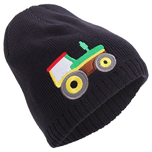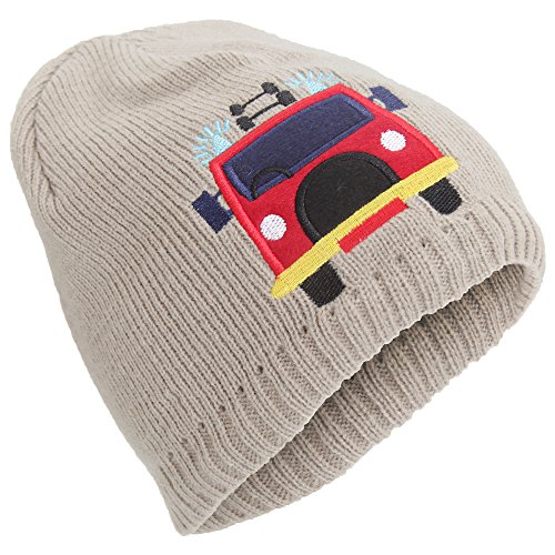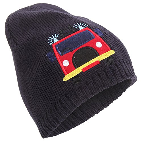 Product Description Boys fire engine/tractor embroidered knitted winter beanie hat. Fleece lined for colder conditions. Slight stretch for a snug comfortable fit. Choice of two designs and four colors. Material: 100% Acrylic. Hand wash only. 0