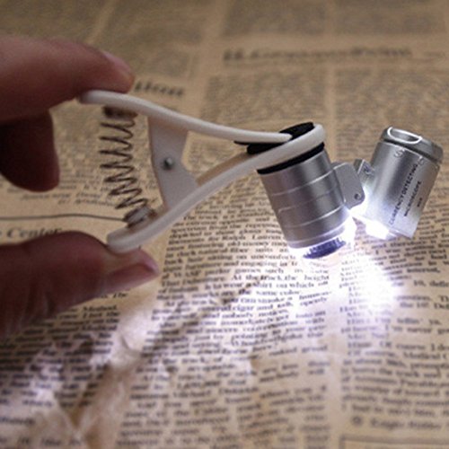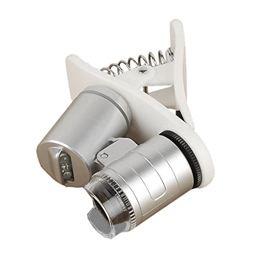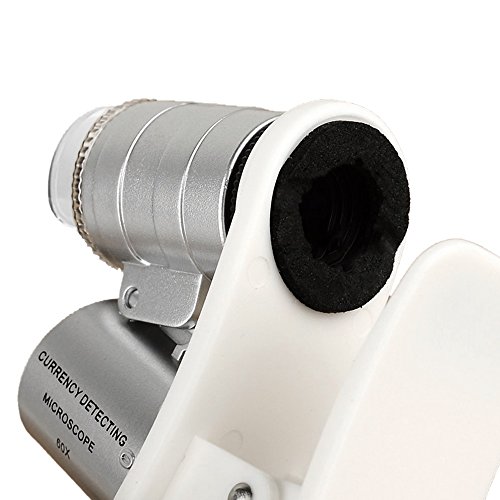 Studio : TOOGOO(R) Publisher : TOOGOO(R) Binding : Electronics Product Description * TOOGOO is a registered trademark. ONLY Authorized seller of TOOGOO can sell under TOOGOO listings.Our products will enhance your experience to unparalleled inspiration. TOOGOO(R) 60X Universal Mobile Phone Mini Portable Clip LED Microscope Magnifier Loupe UV Currency Detector Flashlight Silver Compact and great to have one in your pocket all the time. It is ideal tool for industrial purpose, coin and stamp, etc. Lens Material: Acrylic Frame Material: ABS Color: Silver Battery: 3 * Button Batteries(LR1130) Multiplying power of lens: 60X Lens Diameter: 1cm / 0.4in Item Size(L * H): 4 * 2.7cm / 1.6 * 1.1in Package List: 1 * Microscope 1 * User Manual(English Chinese) 1 * Leather Case 1 * Cloth Bag Note: Light shooting and different displays may cause the color of the item in the picture a little different from the real thing. The measurement allowed error is /- 1-3cm. 0