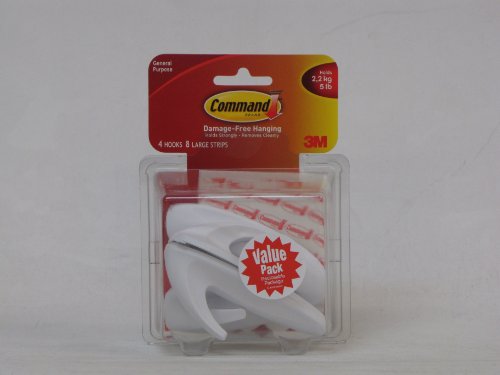 -. Brand : COMMAND -. EAN : 0051141383811 -. Feature : Hanging hooks hold strong to flat surfaces / Removes cleanly without surface damage / Hooks work on a variety of surfaces / Sold in a convenient pack of four / Easy to apply and remove--no tools required -. Label : command -. Manufacturer : command -. ProductGroup : Home Improvement -. ProductTypeName : HARDWARE -. Publisher : command -. Size : 4 Large Hooks -. Studio : command -. Title : Command Large Plastic Hooks Value Pack -. UPC : 051141383811