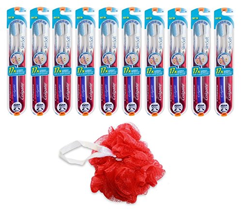 -. Title : 10 Pack Colgate Slim Soft Gliding Tip Toothbrushes plus Bonus Mesh Pouf Bath Sponge