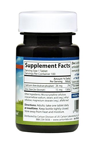 Zinc plays an important role in the production of immune cells, which help protect us from disease. When our body is actively fighting off intruding germs, it can deplete our zinc levels. It's important that we get enough zinc to replenish what our body has used, so it can continue working toward optimal health. Zinc is also important for our skin and helps us build new skin when old skin cells are shed. Each tablet of Carlson Zinc provides 15 mg of zinc from zinc gluconate.Feature