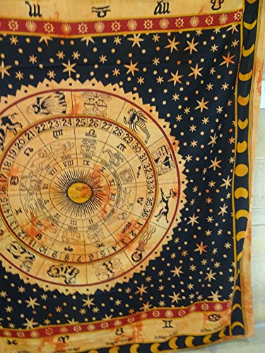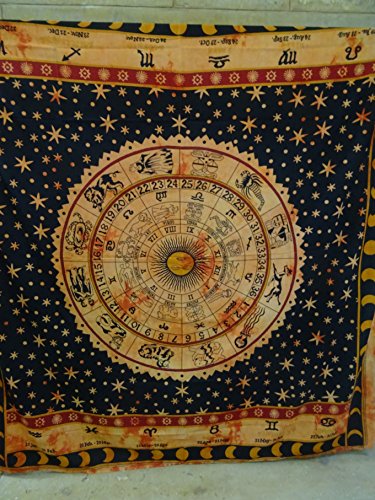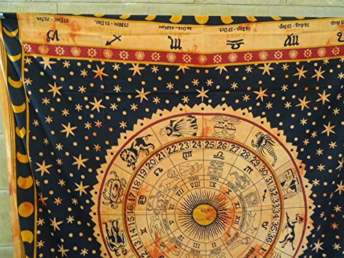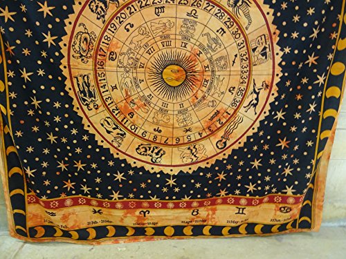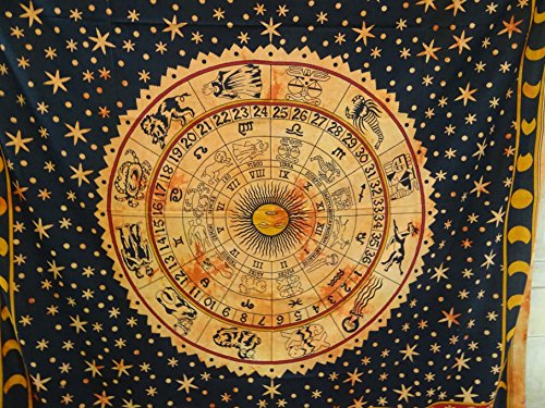 Tribal Asian Textiles Black Zodiac Horoscope Tapestry, Indian Astrology Hippie Wall Hanging, Ethnic Decorative Art, Celtic Zodiac Tapestry.