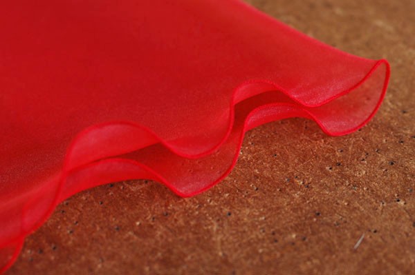 さまざまなバリエーションをお楽しみいただけるリーフデザインです。(えんぴつのように両端がとがっています) シンプルなオーガンジーショールですが、贅沢にバイアスで裁断し、ふちが波打つようにデザインしています。