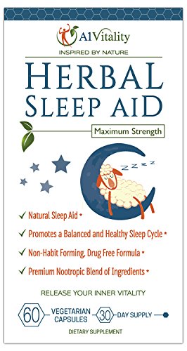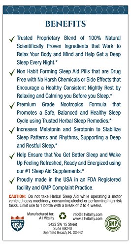 -. Binding : Health and Beauty -. Brand : A1Vitality -. EAN : 0646437118873 -. Feature : ✓ WANT MORE ENERGY? IMAGINE A DEEP RESTFUL SLEEP EVERY NIGHT! Do you have a broken nights' sleep or worse suffer from insomnia or sleep deprivation? Do you get to sleep but don't stay asleep? Are you craving waking up feeling energized and refreshed? We hear you! Our best herbal sleep aid increases Melatonin and Serotonin so that you wake up feeling rested and ready to go! See how much more effective you will be with the benefit of our herbal sleep remedy. / ✓ WHY USE OUR ALL NATURAL SLEEP AID? Are you worried about the unnecessary chemicals in your body? Our deep sleep herbal medicine works to relax your body and help produce natural serotonin. Our best sleeping pills with Melatonin and Valerian, Lemon Balm, Magnesium, Hops and Chamomile are non-habit forming for complete reassurance. Feel great, get a deep sleep, and do it with our all natural sleeping pills! / ✓ NO ONE LIKES FEELING TIRED AND SLISH IN THE MORNING. Prescription sleeping pills often have side effects and can leave you feeling slish and groggy when you wake up. Discover the joy of natural sleep remedies and feel refreshed and energized as our natural sleeping aid is drug-free and non-addictive and ensures you wake up every day feeling rejuvenated and full of energy. / ✓ CALM YOURSELF AND GET TO SLEEP FAST AND SLEEP ALL NIGHT! Herbal Sleep Aid is proudly made in the USA in a GMP Certified Lab facility for premium safety and quality. Our sleep aid supplements use trusted and proven high quality natural ingredients to give a restful deep sleep. Our non-habit forming sleep aid pill contains no harsh chemicals, sugars or caffeine. / ✓ 100% NO HASSLE MONEYBACK GUARANTEE! 1 Month Supply / 60 Capsules per Bottle. If you're not satisfied for any reason we'll refund your entire purchase because we're people too and that's what we would want! -. IsAdultProduct : 0 -. Label : A1 Vitality -. Manufacturer : A1 Vitality -. ProductGroup : Health and Beauty -. ProductTypeName : HEALTH_PERSONAL_CARE -. Publisher : A1 Vitality -. Studio : A1 Vitality -. Title : Herbal Sleep Aid - Natural Sleep Aid - Non-Habit Forming Sleeping Pills - Includes Valerian Root, Melatonin, Lemon Balm, Chamomile - Aids Serotonin - 100% Money Back Guarantee - 60 Vegetarian Capsules -. UPC : 646437118873