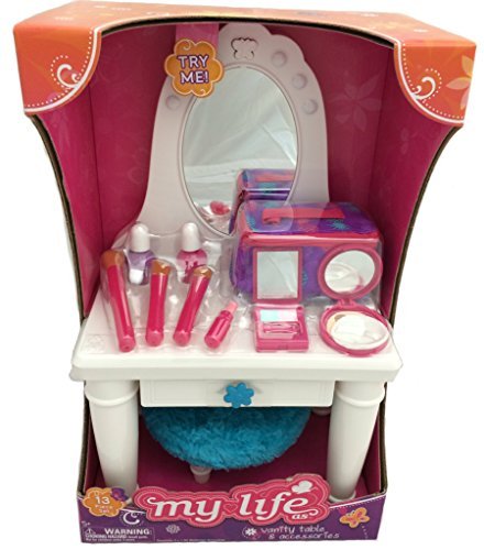 -. Feature : Vanity has a stool and draw / Make-up brushes, compact and puff, eyeshadow compact / Lip-stick, fingernail polish, and cosmetic bag
